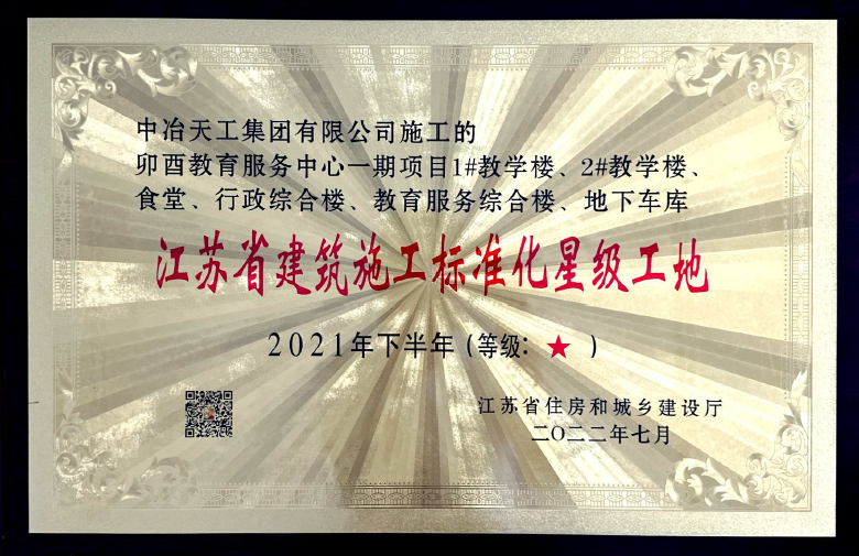 T2022-124卯酉教育服务中心一期项目1#教学楼、2#教学楼、食堂、行政综合楼、教育服务综合楼、地下地库2021年下半年江苏省建筑施工标准化星级工地(牌匾)