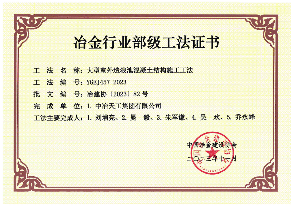 獲評(píng)工法《大型室外造浪池混凝土結(jié)構(gòu)施工工法》借助公司滄州文化旅游城項(xiàng)目實(shí)施過程而總結(jié)提煉形成一種大型室外造浪池混凝土結(jié)構(gòu)施工技術(shù),解決了施工過程中異形結(jié)構(gòu)模架支設(shè)困難、大體積混凝土水化熱釋放不完全、多層大底板內(nèi)預(yù)埋給水管上浮、大底板弧形表面標(biāo)高控制誤差過大等難題;工法《高層建筑大坡屋面施工工法》以滄州濱海童世界項(xiàng)目為依托,通過優(yōu)化項(xiàng)目大坡屋面施工措施方案,設(shè)計(jì)便捷的施工操作平臺(tái),不僅提高坡屋面的施工效率,降低成本,更有效保障施工人員的安全。