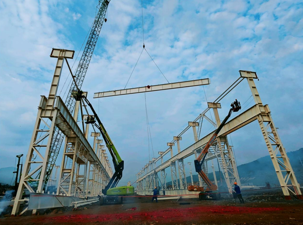 8月8日,工業工程公司華峰鋁業有限公司年產45萬噸新能源汽車用高端鋁板帶箔智能化建設項目完成廠房第一組屋面梁吊裝作業,標志著該項目正式邁入鋼結構施工全面快速建設階段。