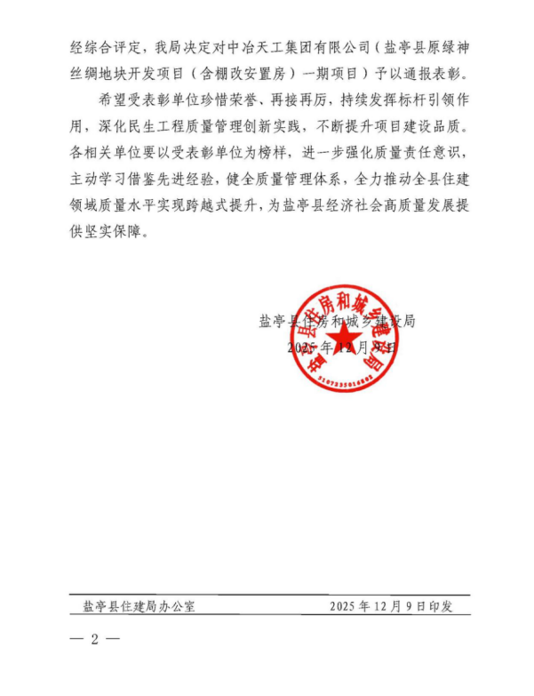 榮譽在肩,責(zé)任在身。項目部將以此次通報表彰為契機,再接再厲、精益求精,持續(xù)發(fā)揮標(biāo)桿引領(lǐng)作用,深化民生工程質(zhì)量管理創(chuàng)新實踐,不斷提升項目建設(shè)品質(zhì)。同時,將積極分享質(zhì)量管理經(jīng)驗,與行業(yè)同仁攜手共進(jìn),助力屬地住建領(lǐng)域質(zhì)量管控水平有效提升,以實際行動踐行企業(yè)社會責(zé)任,為鹽亭縣經(jīng)濟(jì)社會高質(zhì)量發(fā)展貢獻(xiàn)“天工力量”!