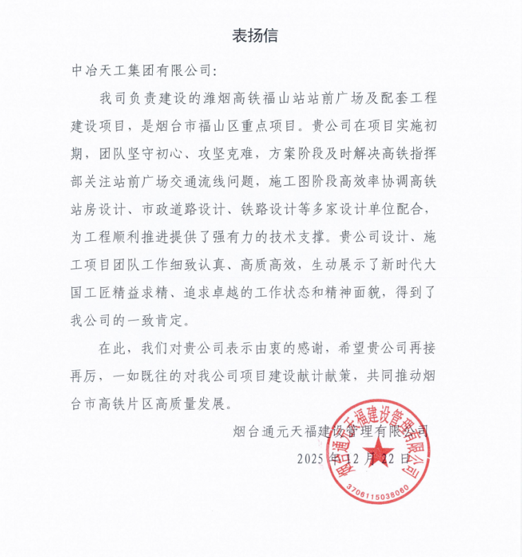 近日,工程技術(shù)總院濰煙高鐵福山站站前廣場及配套工程設(shè)計項目,收到業(yè)主單位煙臺通元天福建設(shè)管理有限公司致中冶天工的表揚信。信中,業(yè)主單位對中冶天工設(shè)計和施工團隊展現(xiàn)出的高效協(xié)作能力及精益求精的優(yōu)質(zhì)服務(wù)給予高度贊譽,對團隊在項目推進過程中攻克難題、保障進度的付出致以誠摯感謝。