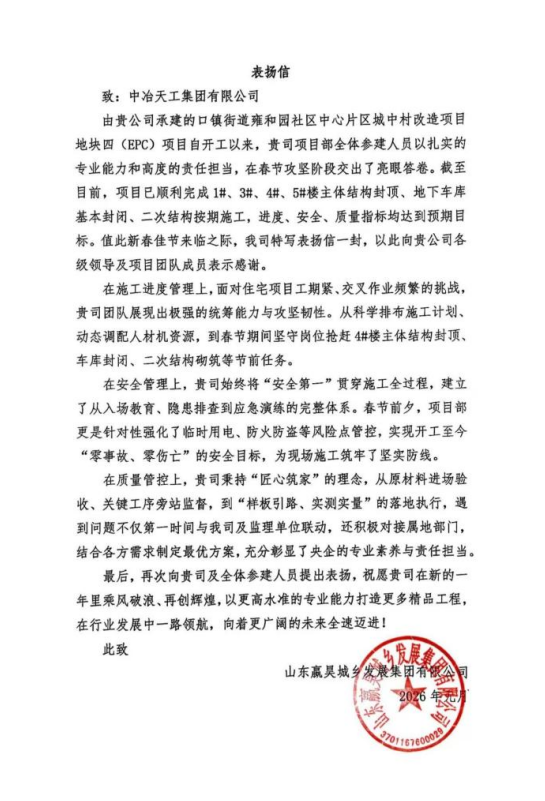 近日,由工業(yè)工程公司承建的山東省濟(jì)南市口鎮(zhèn)街道雍和園地塊四項(xiàng)目收到業(yè)主的表?yè)P(yáng)信,信中對(duì)項(xiàng)目在春節(jié)攻堅(jiān)階段的卓越表現(xiàn)給予了高度肯定與誠(chéng)摯感謝。